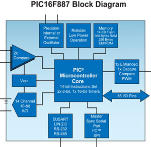 The PIC16F88X family maintains compatibility with the PIC16F87XA family for easy migration, while providing a host of new features designed to save users time and money — both during and after their design cycle. The enhancements include dual internal oscillators with clock switching and fail-safe clock mode; more (up to 14) ADC channels; an advanced comparator module featuring two comparators and a Set/Reset Latch to allow emulation of many analog circuits; and low-power enhancements that extend battery life.- Embedded system designers' marketplaces are constantly changing. Quite often, functions and features are added to a customer's product in the middle of the design cycle, as new requirements emerge. Therefore, system designs must be fluid and easily adaptable in order to evolve with the changing landscape. These dynamics require a high degree of flexibility from the chosen microcontroller architecture. Microchip's PIC16F88X family is complemented by a vast portfolio of pin- and code-compatible PIC microcontrollers that enable customers to quickly move to the right part for their chosen application, without having to write all new code.